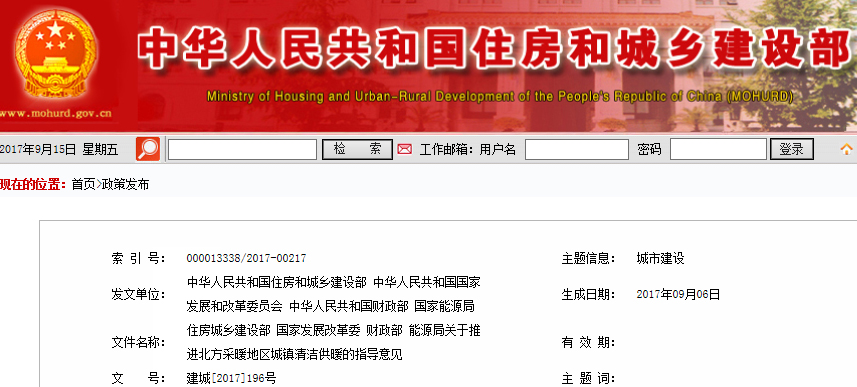2017年9月14日【政策法规】四部门联合推进北方冬季清洁取暖试点工作