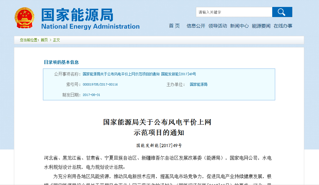 2017年9月14日【政策动态】国家能源局关于公布风电平价上网示范项目